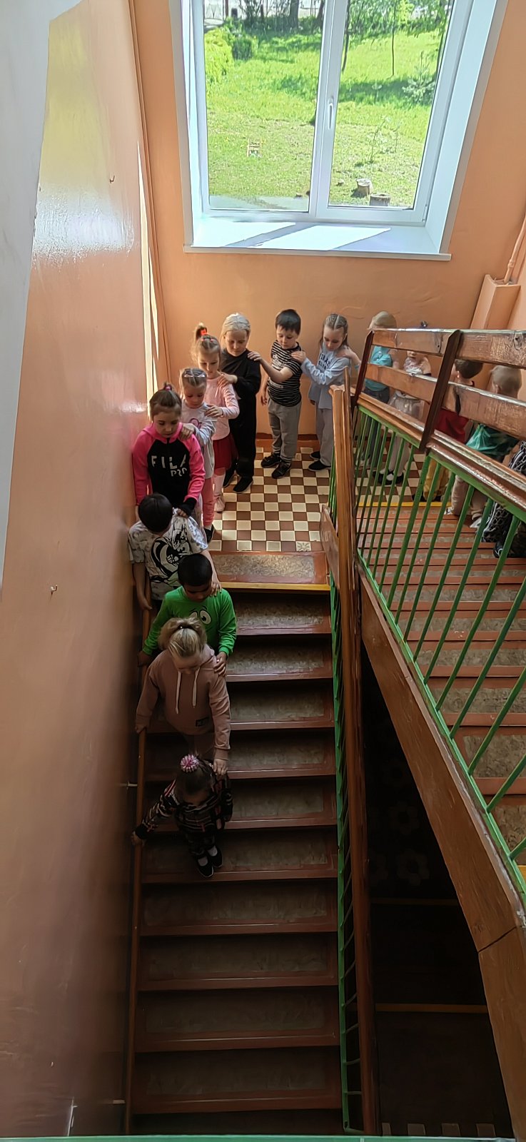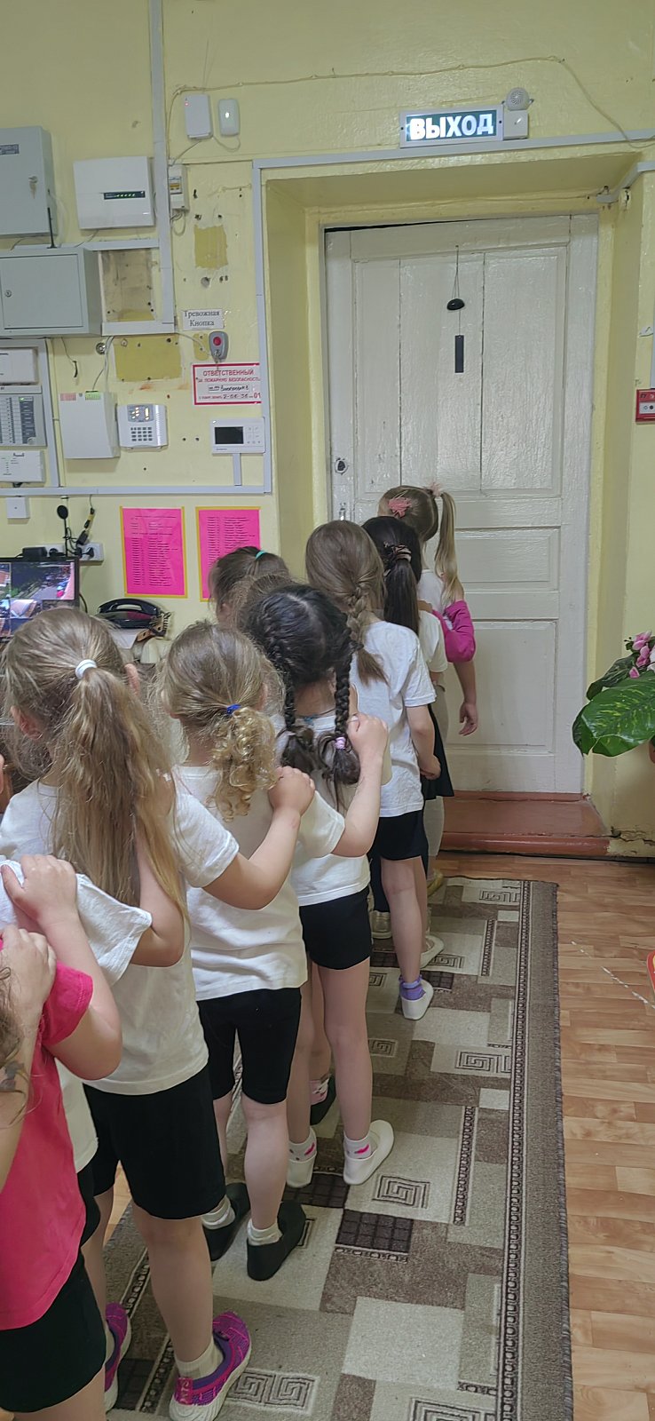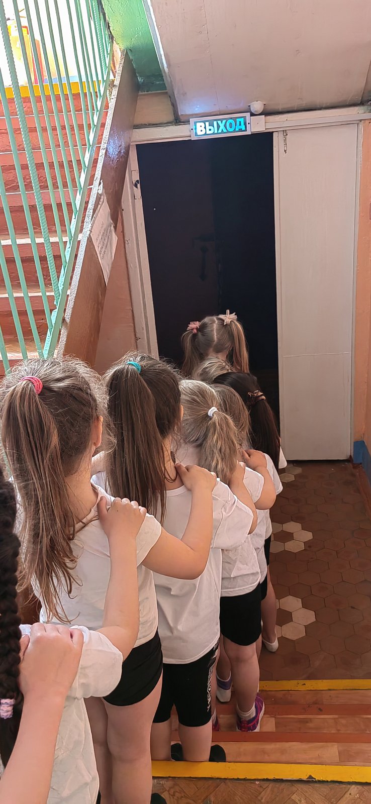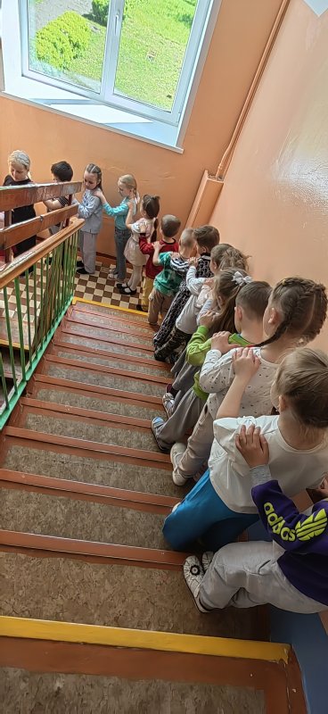Дети спокойно спускались по лестнице держа за плечо впереди идущего. Без паники все вышли к эвакуационному выходу.
