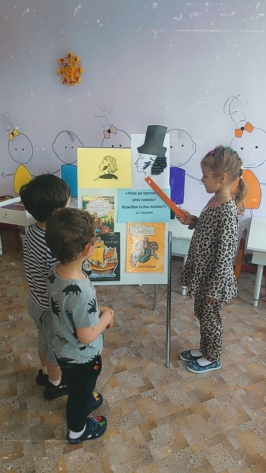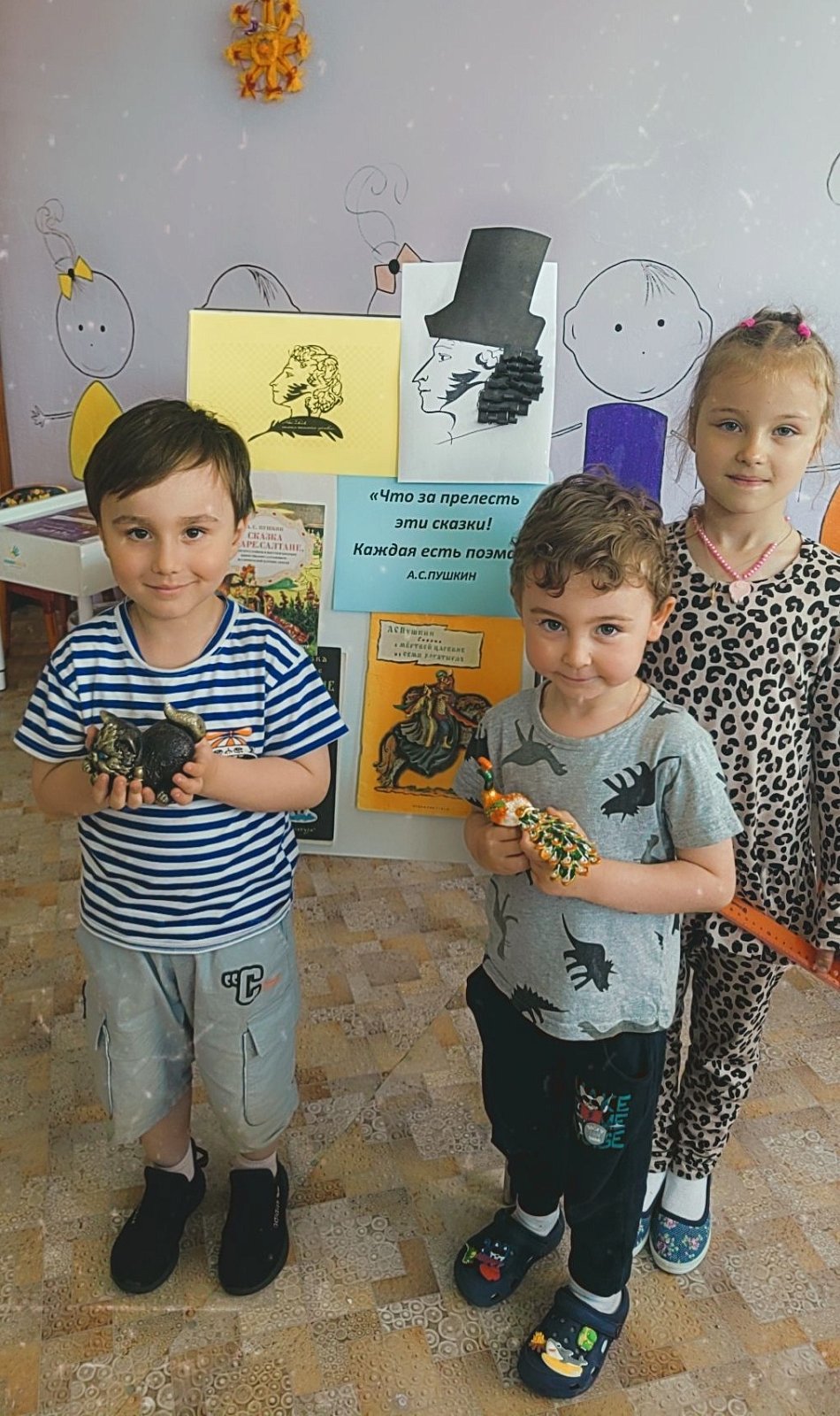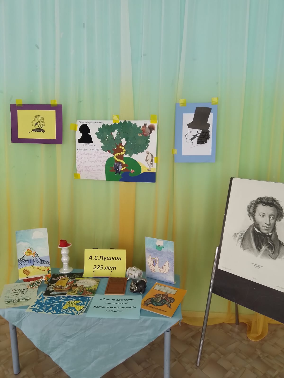 Для ребят была организована выставка книг Пушкина, а так же совместно сделанные работы , с детьми. Все дети остались довольны.