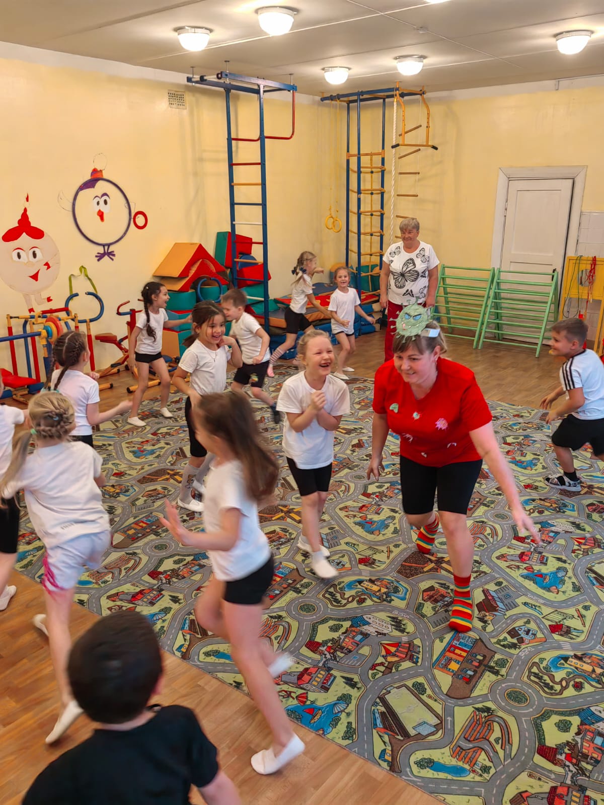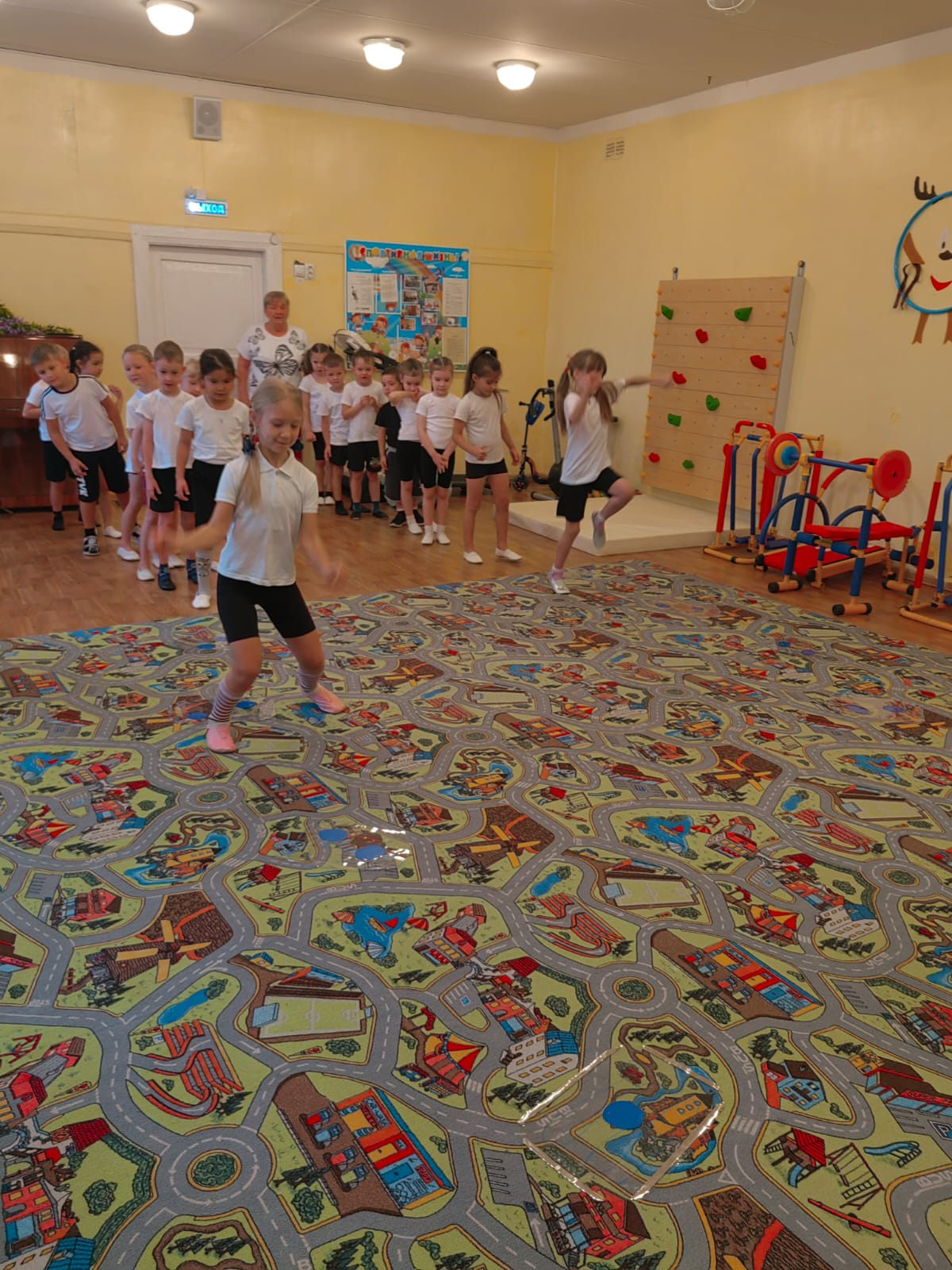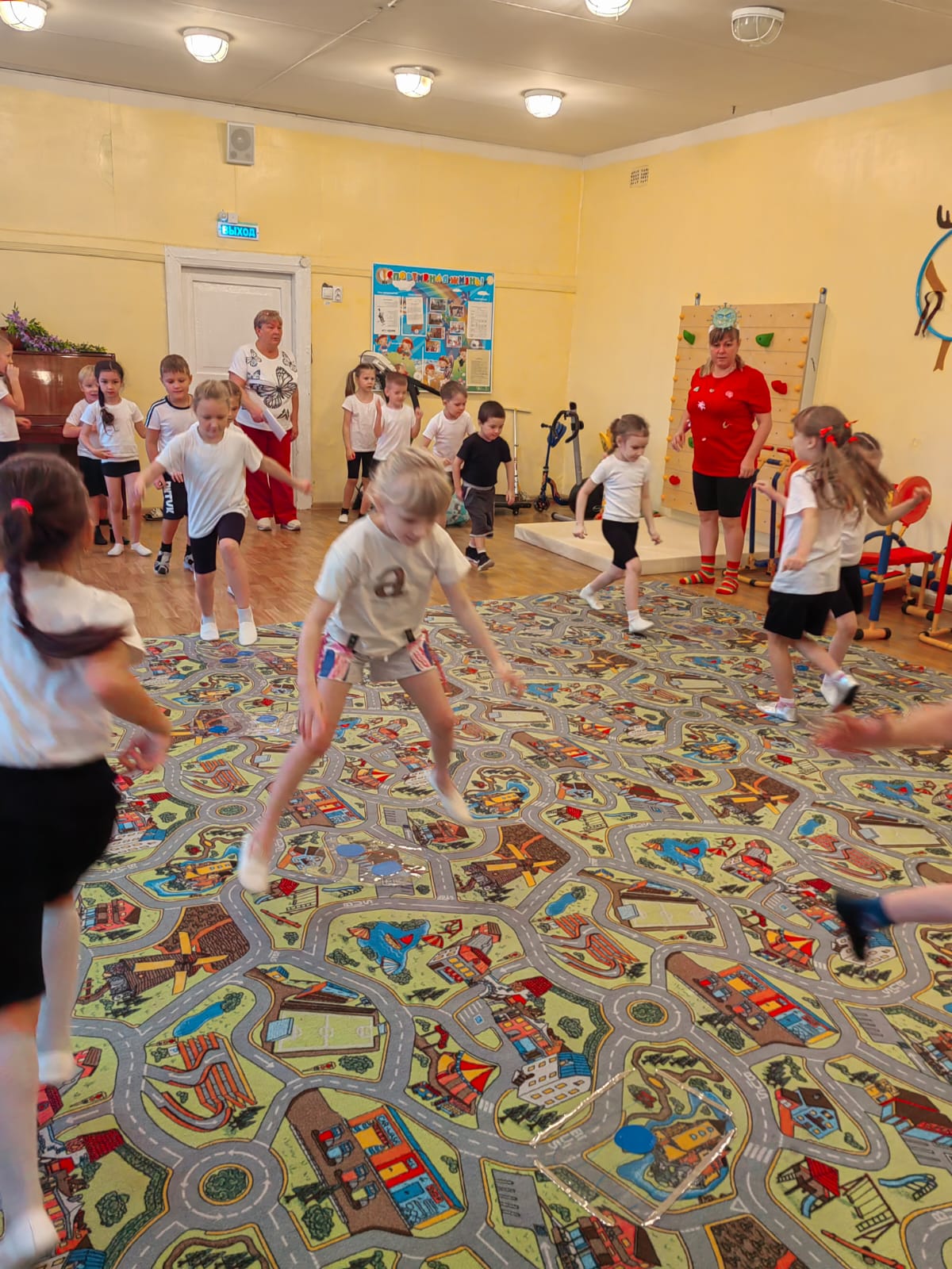 " Ягодка", Елена Алексеевна и Людмила Викторовна, провели в игровой форме: с зарядкой, играми и эстафетами, под музыку выполнили корригирующие виды ходьбы.