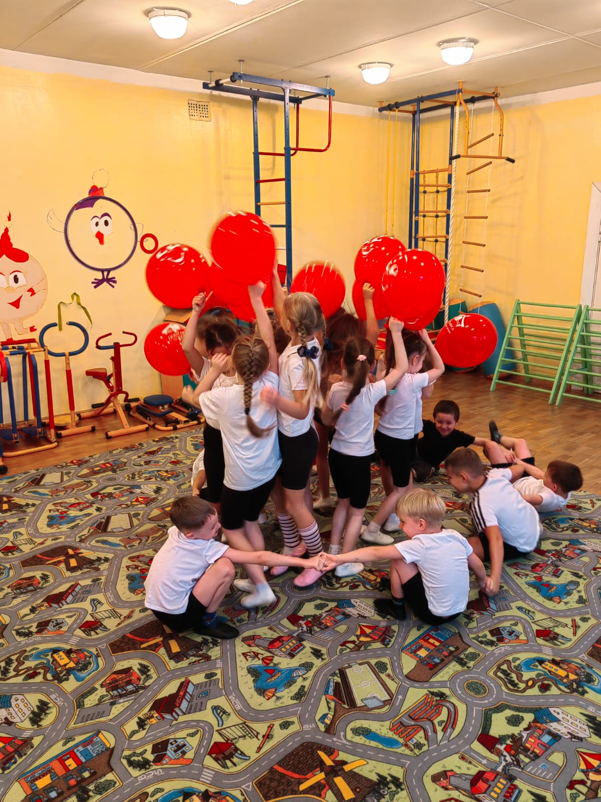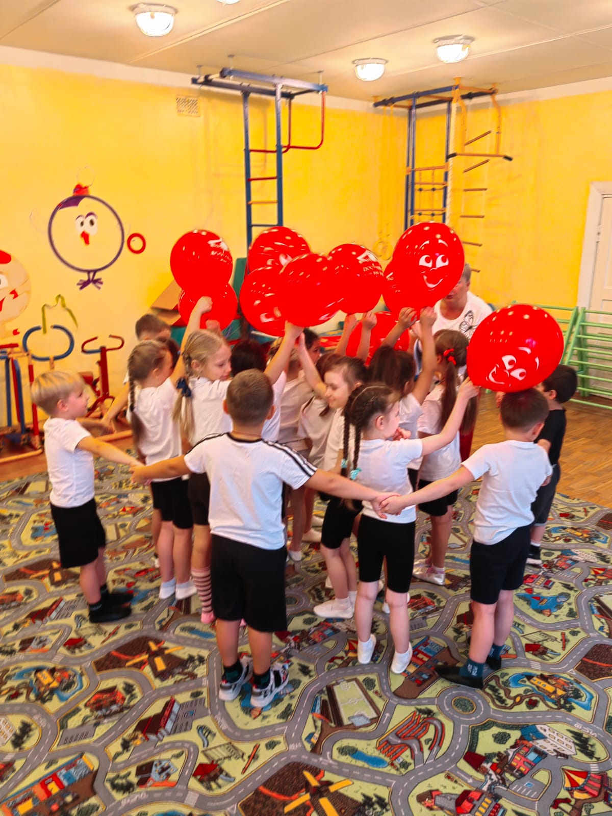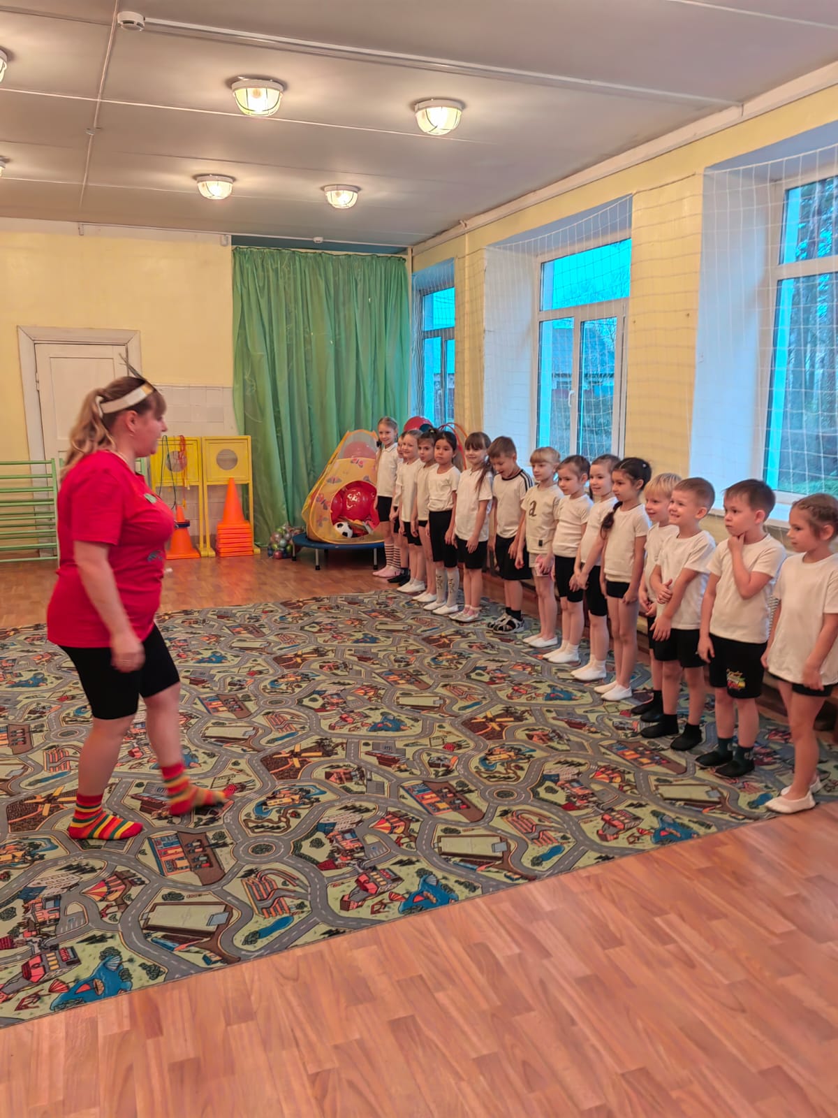 " Ягодка", Елена Алексеевна и Людмила Викторовна, провели в игровой форме: с зарядкой, играми и эстафетами, под музыку выполнили корригирующие виды ходьбы.