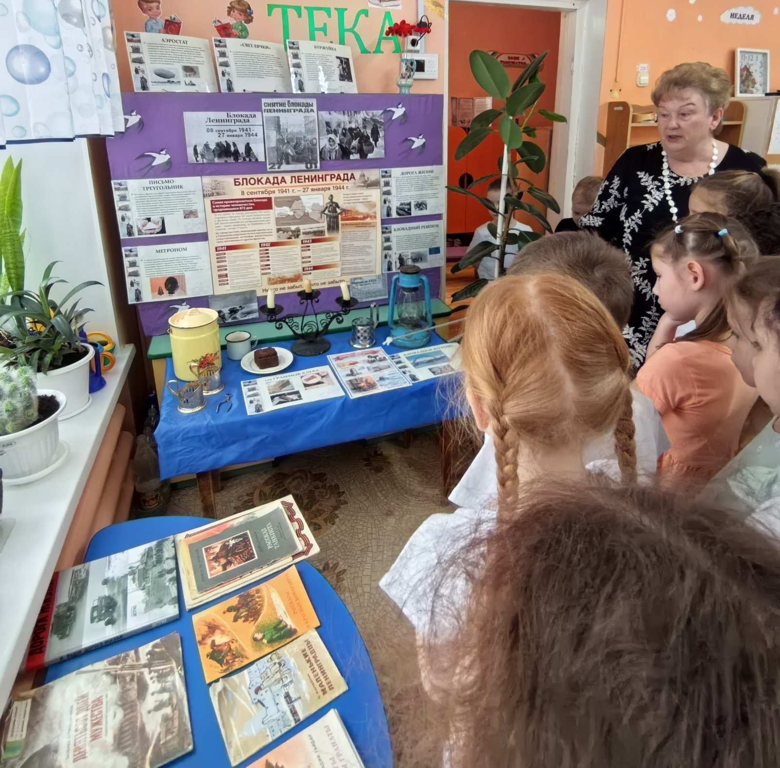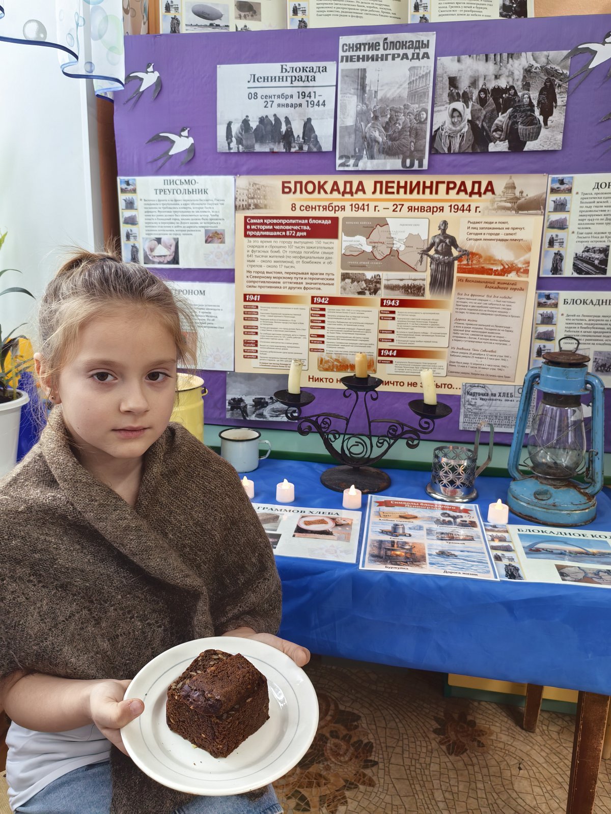 Особое внимание было уделено символическому значению блокадного хлеба. Елена Алексеевна, показала детям образец кусочка хлеба.
